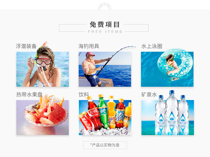 選配項(xiàng)目: 摩托艇、飛魚、香蕉船、水上飛行器、飛拖、滑板